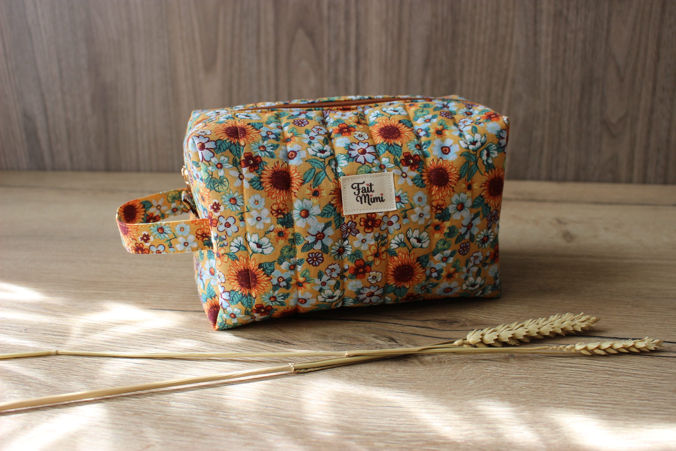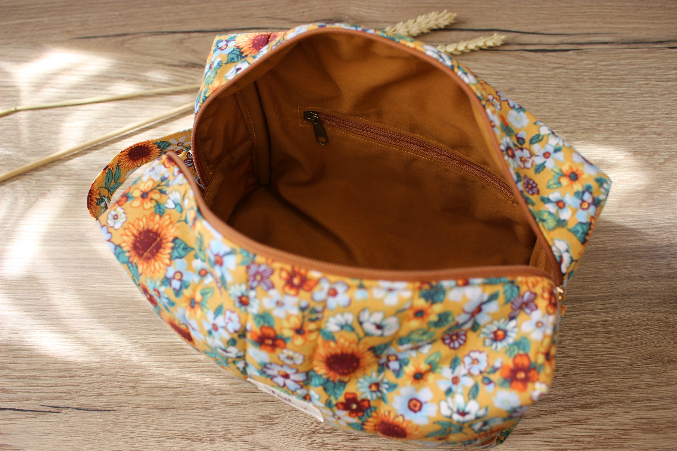 - Couleur(s) : extérieur à motif floral (jaune, orange, bleu, vert, marron…), intérieur camel.
